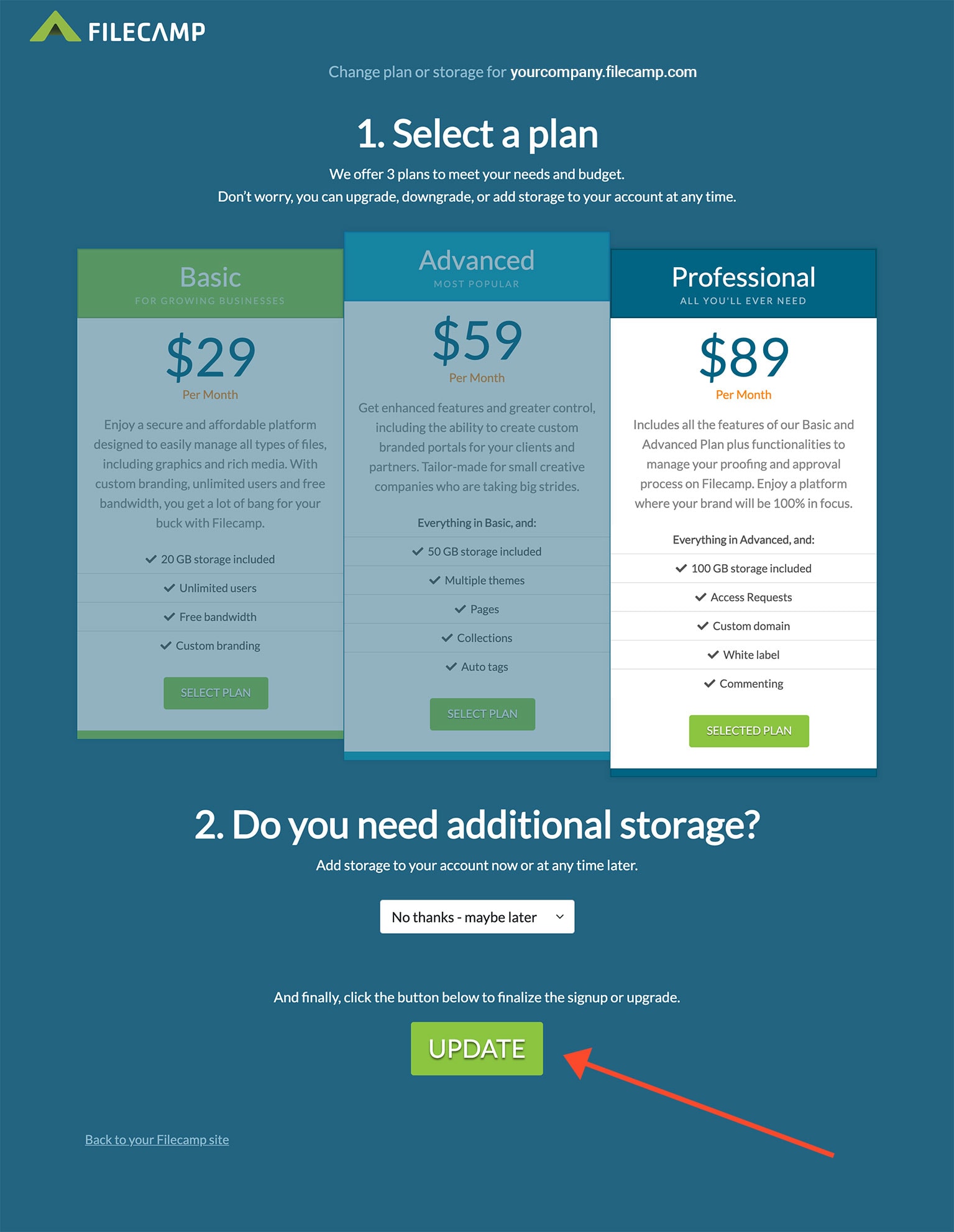 Filecamp will always make clear which plan you’re using. If you want to change your plan, click “Change Plan or Storage".