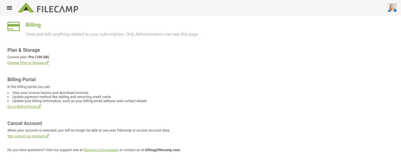 Log in to your Filecamp, click on the Main menu and navigate to Admin > Billing.