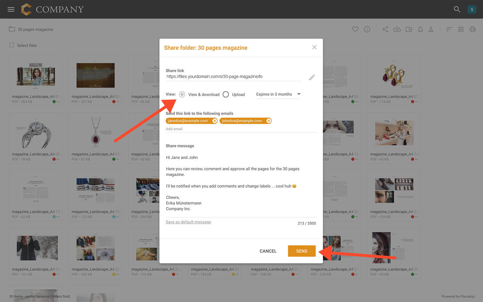 Make sure you have selected the View & Download checkbox in the Share folder pop-up window. Enter the email addresses of your reviewers, set an expiration date for the link, and write a short message that will be included in the email. Read more about Share folder links.