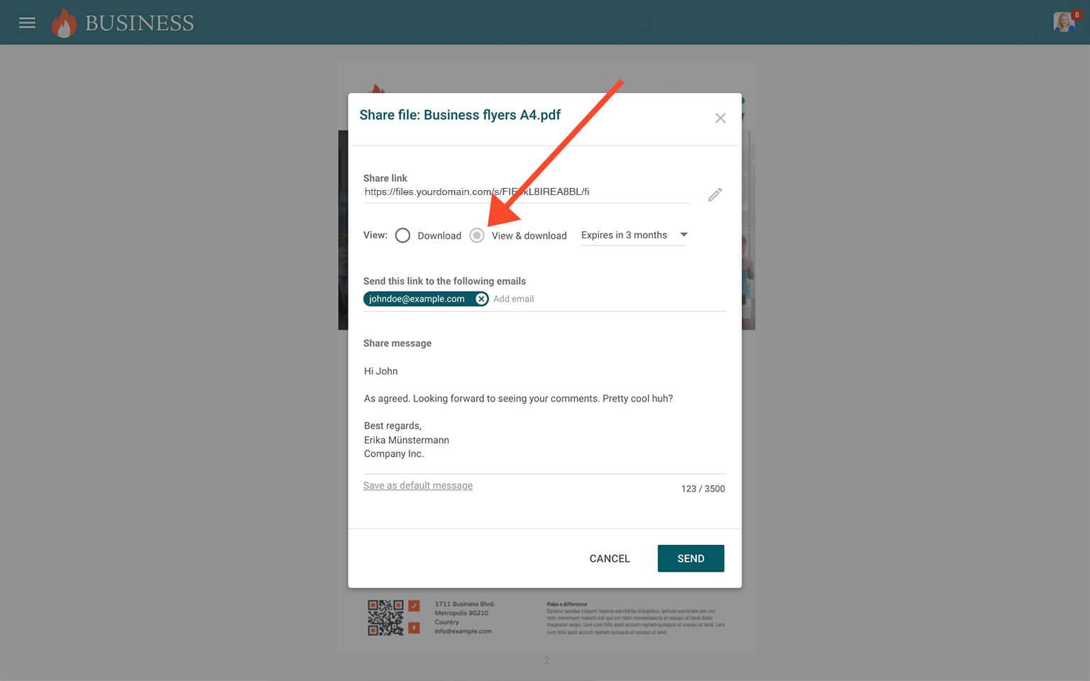 Make sure you have selected the View & download link checkbox in the Share file pop-up window. Enter the email addresses of your reviewers, set an expiration date for the link, and write a short message that will be included in the email. Read more about Share file links.
